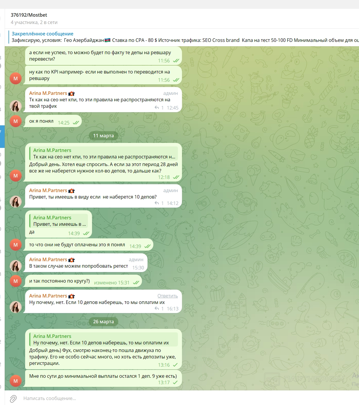 Всем привет. В общем сказать что я охренел, это ничего не сказать. Кинули меня на выплату в 1100$, типа фрод трафик. Теперь по порядку: во первых сами спамили личку в ТГ мол давай лей на нас. Я к ним не просился, я работаю достаточно времени с другой ПП по гембле. Решил попробовать. После того, как обговорили нюансы залива, решил остановиться на SEO трафе на АЗ. У них условие, что есть тестовый период и нужно в первые 14 дней отлить минимум 10 депов, если не успеваю, дадут еще +14 дней, Т.е. за 28 дней я должен дать им 10+депов для оценки трафика. 28 марта долетел десятый деп ну и дальше пошло все интересное. Сначала менеджер говорит, нужно подождать до 4 апреля (это 28 дней спустя первого депа), потом что будет проверка на фрод. Мы договорились, что проверку на фрод трафа запустят раньше срока, что бы к 4 апреля можно было получить выплату первую. Через день, как запросили проверку на фрод, у меня в аккаунте все мои депы перешли из холда в апрув. Думаю ну все, значит проверку прошли, осталось ждать 4-го апреля. 4 апреля (в пятницу) их отдел провел аналитику, решили работать далее, но тут мне менеджер пишет, что придет в понедельник проверка на фрод, сразу оплатим. Я думаю странно, но ладно. И вот 7 апреля, мне менеджер пишет «Сегодня была проведена повторная проверка отделом фрода на твоем аккаунте. Получила фид, что фрод подтвержден и по причине нарушений условий сотрудничества мы вынуждены забанить кабинет». Как вам такое? Все пруфы, скриншоты статистики и переписки прикрепляю. Я не знаю, может мне так повезло или у них такая метода сейчас работы, привлекать веб мастеров на один раз. Максимум срубить и кинуть. И еще: менеджер не стеснялся еще просить трафика на время проверки (я специально стопнул траф к ним) пока идет время проверок, спрашивать когда мы можем ждать объемы, давай заливай и так далее. Т.е максимально думают за свою прибыль. На других им просто все равно.